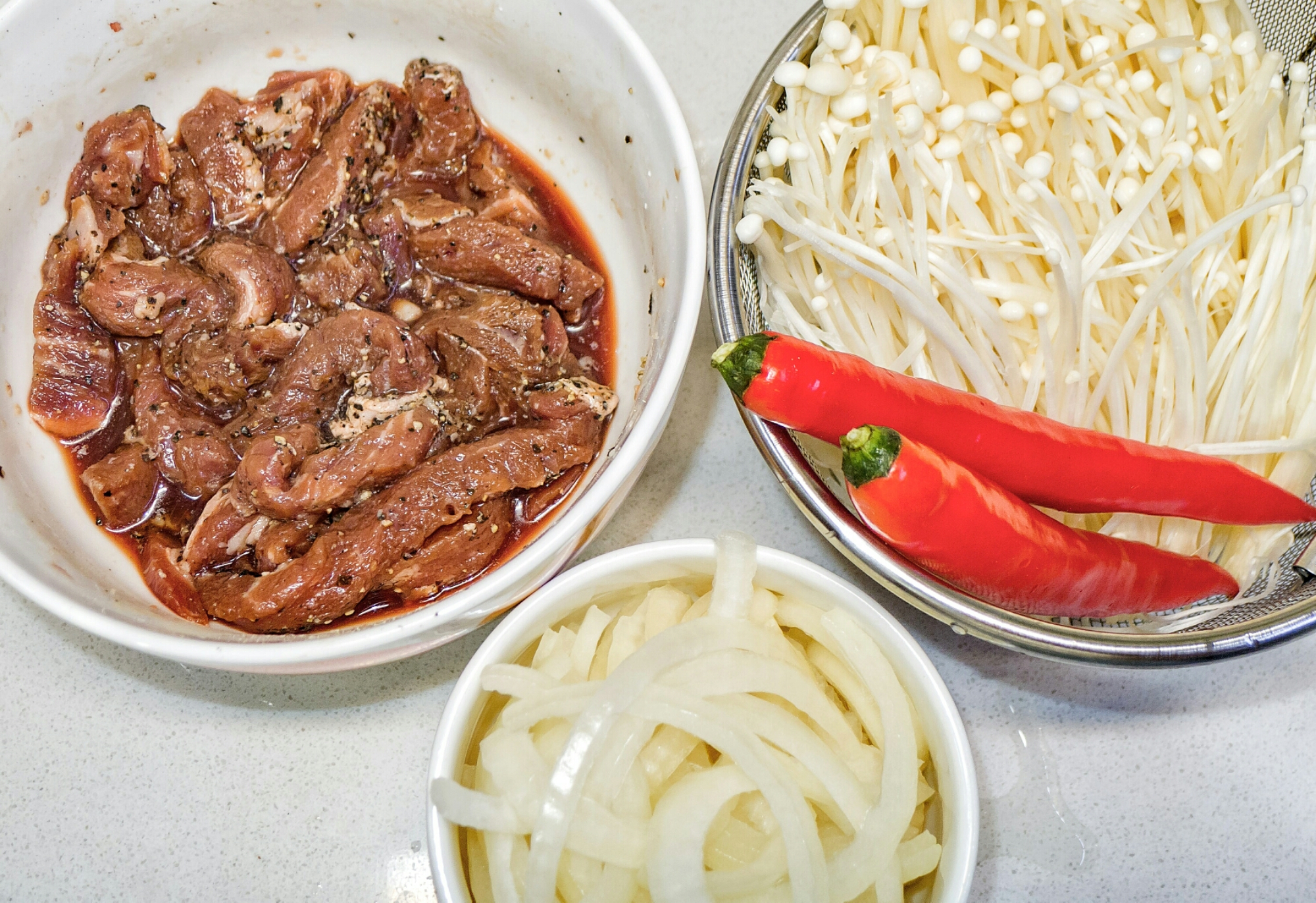 - 牛柳洗凈,瀝乾水份,切成條狀,加入醃料,醃約15分鐘;洋蔥切粗絲;紅尖椒切小塊;金菇切去尾部,洗淨並瀝乾水份,分成小束