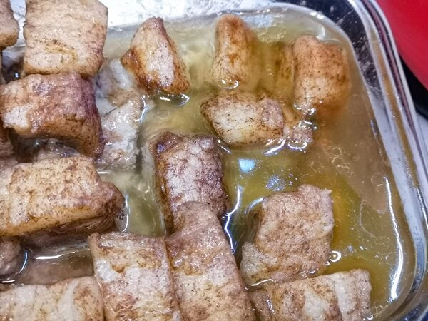 1. 五花肉洗淨印乾水份,切件約1寸x1寸,加入所有調味料拌勻,放雪櫃醃最少一晚;