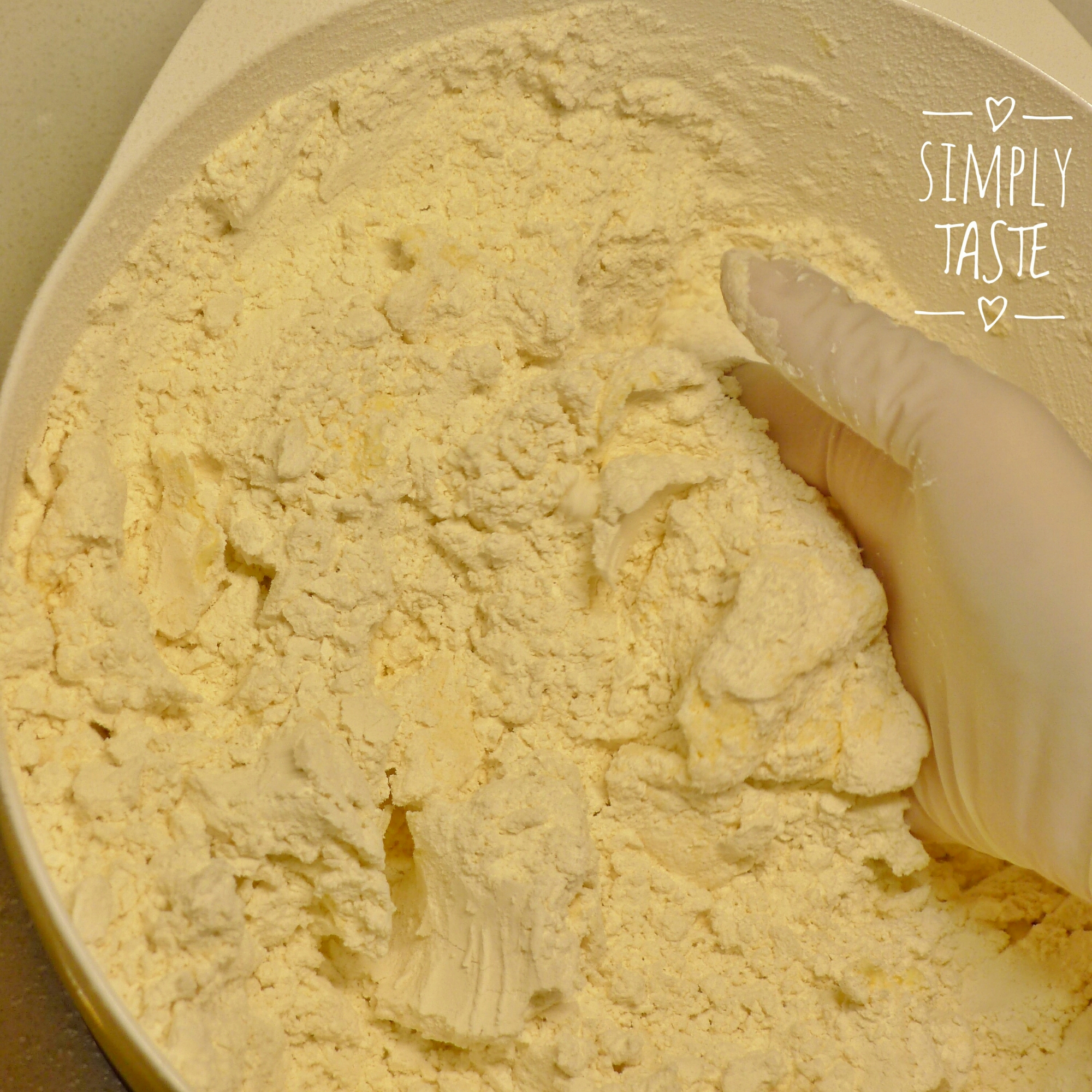 - 篩入低筋粉,用手輕力搓勻成糰至無粉粒即可;