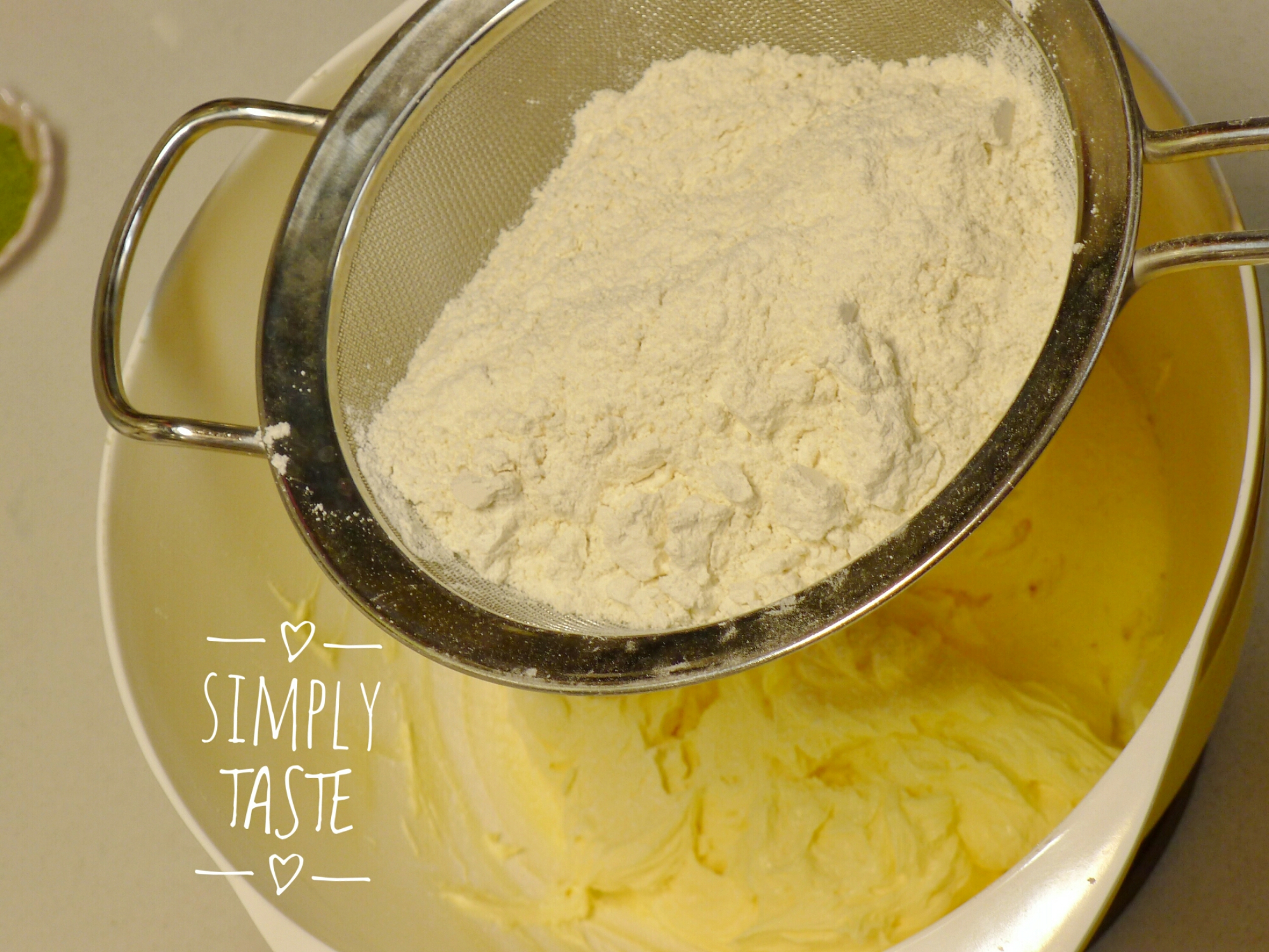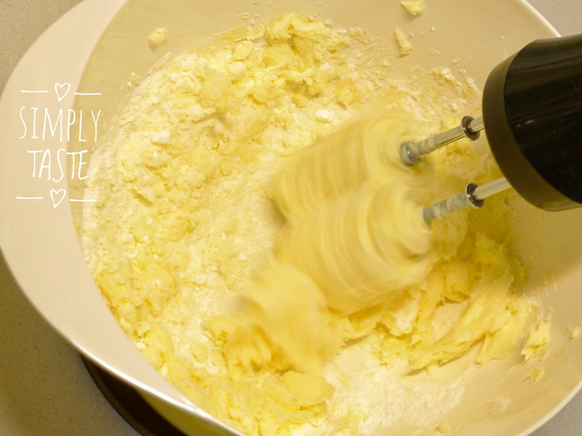 - 低粉先過篩一次,牛油室溫放軟,用電動攪拌器中速略打散,再篩入糖霜,以高速打至淡黃色乳霜狀;